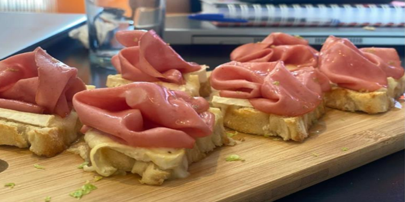 - Dispor as fatias de pão ciabatta em uma assadeira, cobrir cada fatia com um pedaço de queijo brie e levar ao forno para dourar por aproximadamente 5 minutos à 200°C. Retirar do forno e em cada bruschetta, colocar uma fatia de mortadela, com altura, conforme a imagem. Finalizar com um fio de mel em cada bruschetta e raspas de limão siciliano.