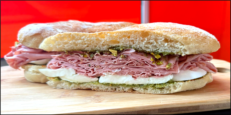 - Cortar o pão ciabatta no sentido do comprimento, passar a Doriana e aquecer no forno até ficar levemente dourado. Passar o molho Pesto na base do pão, colocar as fatias de mussarela de búfala, colocar a mortadela de maneira que fiquem dobradas mas não amassadas, salpicar o pistache e fechar com a coroa do pão com Pesto.