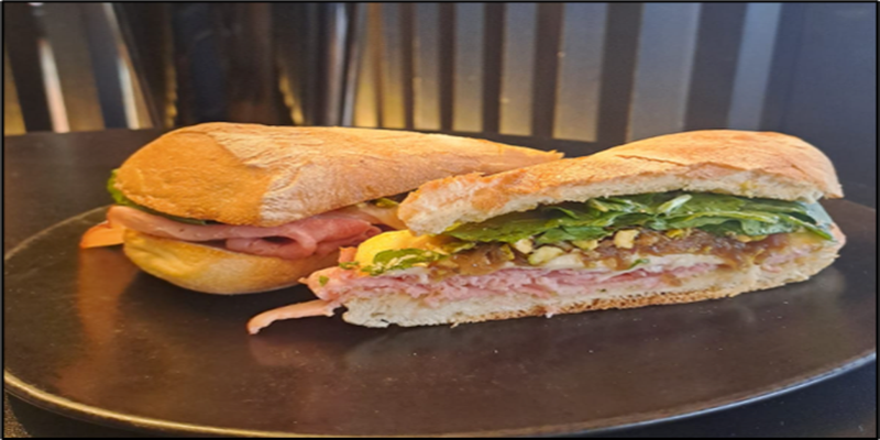 - Cortar o pão Ciabatta no sentido do comprimento, passar a doriana e aquecer no forno até ficar levemente dourado. Em uma travessa de alumínio, colocar as fatias de tender com o queijo gruyere por cima e aquecer por 3 minutos à 160°C até derreter o queijo. Montar o lanche conforme ordem: base do pão, molho mel e mostarda na base, tender com gruyere derretido, cebola caramelizada, pistache triturado, folhas de rúcula e a coroa do pão com mais molho de mel e mostarda